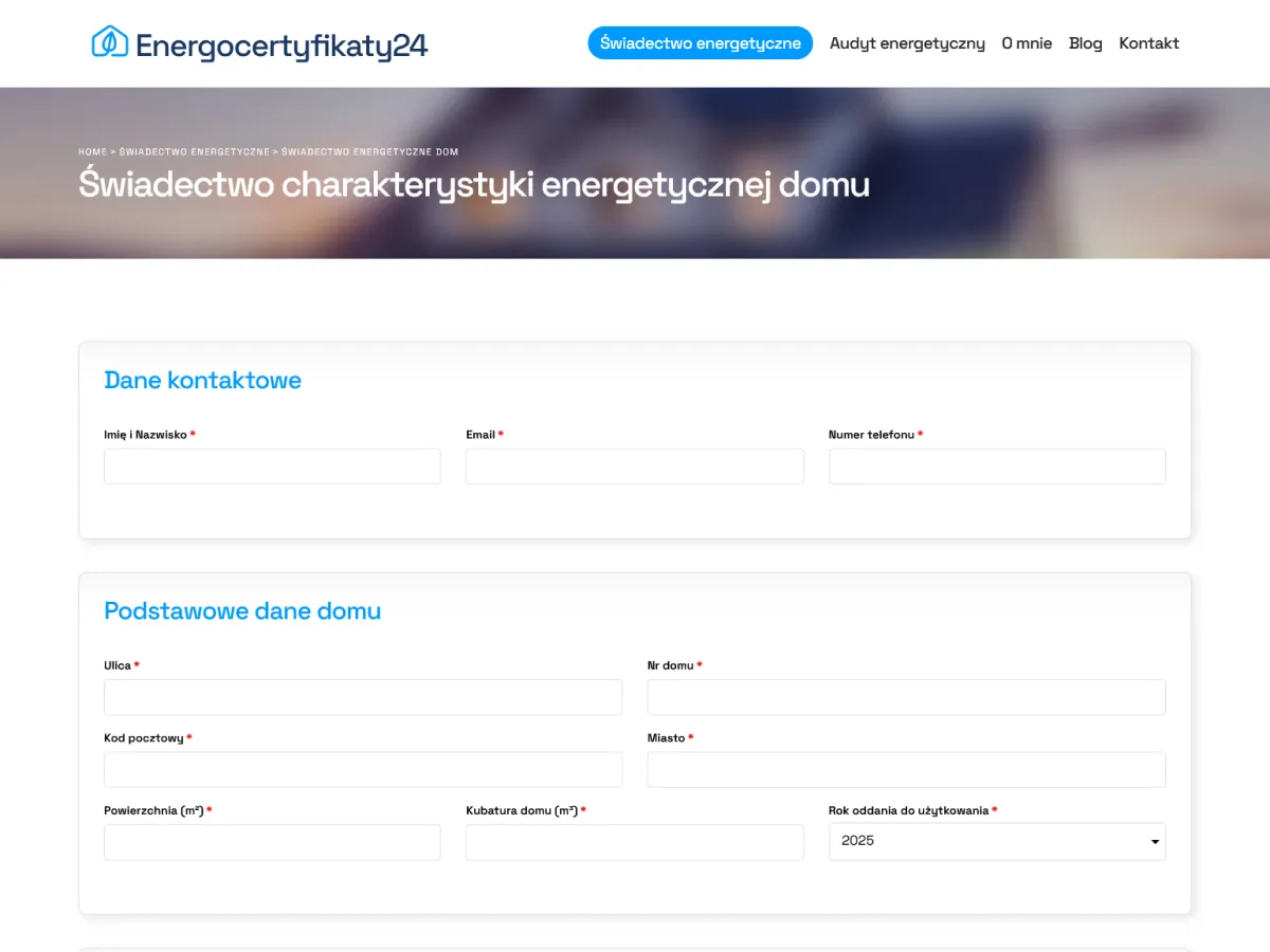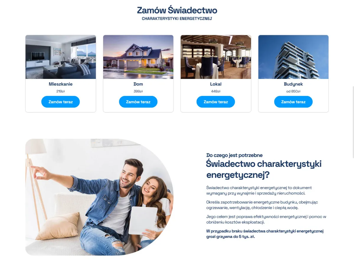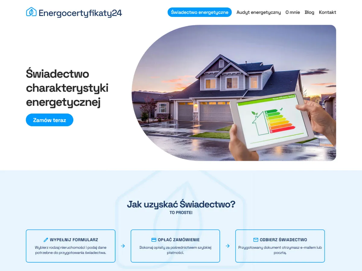 Dla naszego klienta stworzyliśmy funkcjonalną i nowoczesną stronę sprzedażową Energocertyfikaty24, dedykowaną usługom związanym ze świadectwami i audytami energetycznymi. Kluczowe elementy strony to: