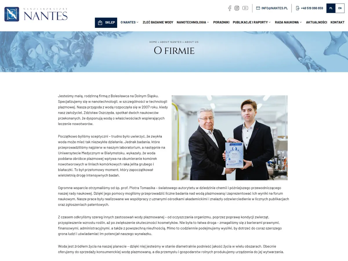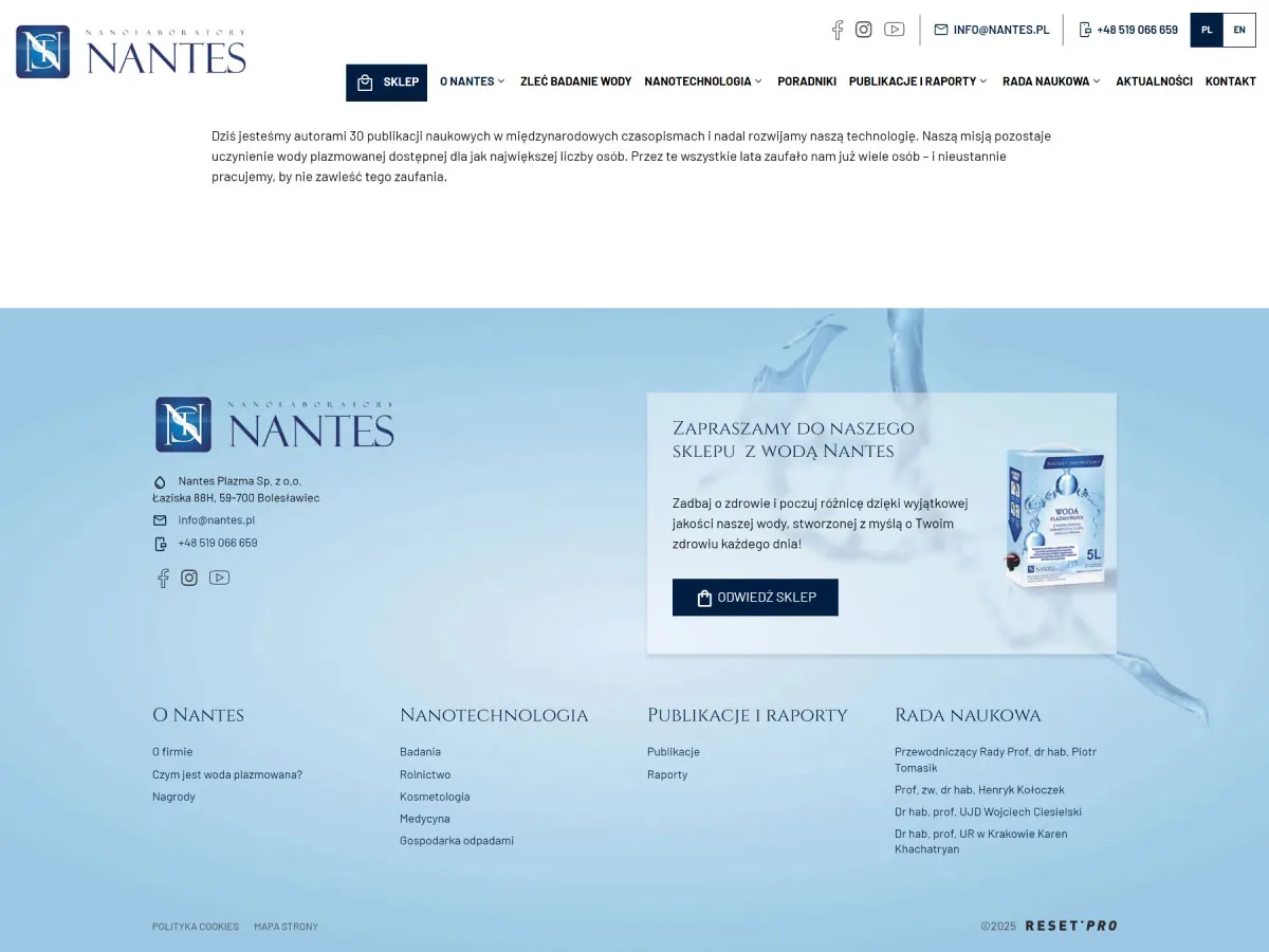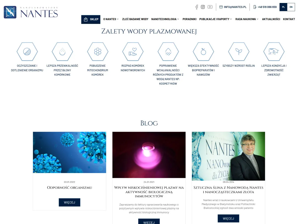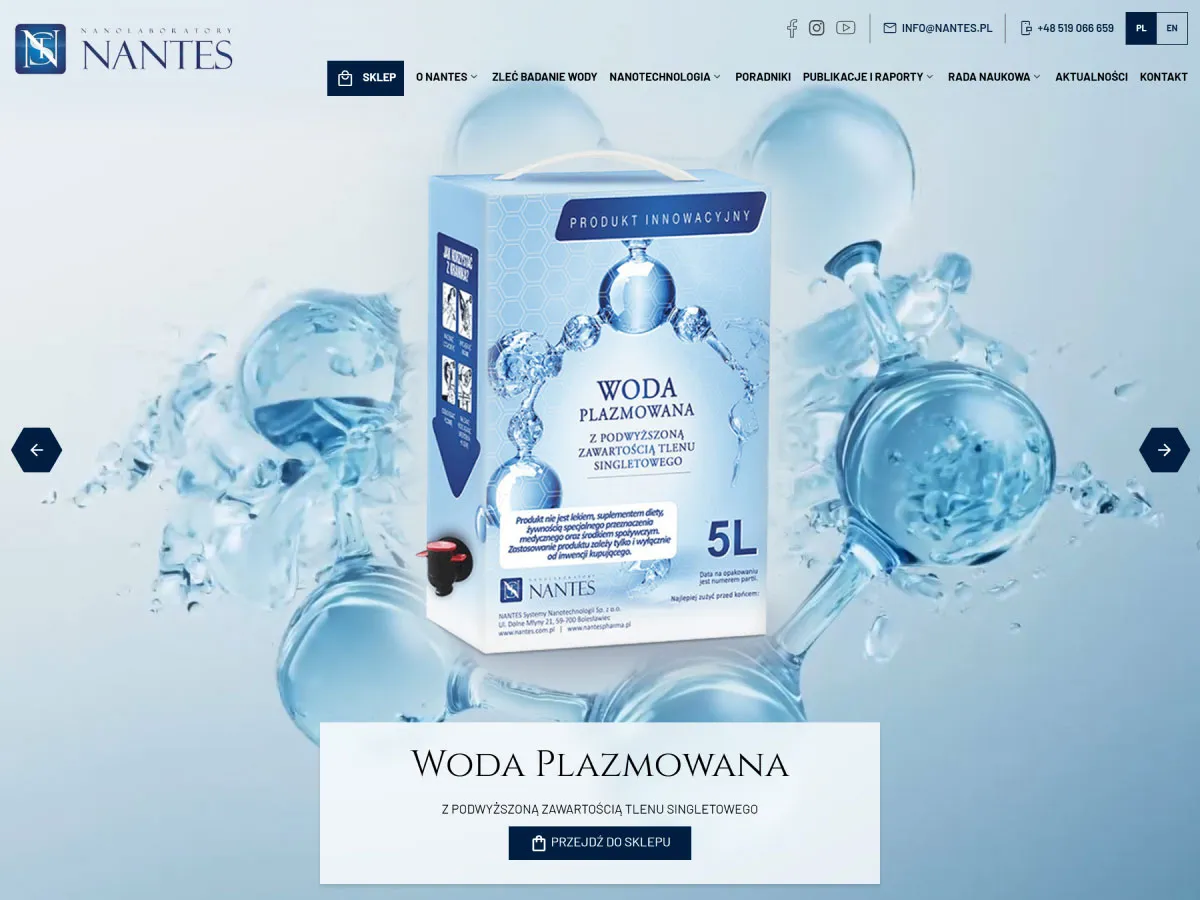 Dla marki Nantes opracowaliśmy kompleksową usługę obejmującą wielojęzykową stronę internetową w oparciu o nasz autorski system Rcms oraz sklep e-commerce oparty na PrestaShop. Projekt wyróżnia się nowoczesną i przejrzystą szatą graficzną, która podkreśla naukowo-technologiczny charakter produktów marki. Zadbaliśmy o czytelną prezentację treści, poradników i artykułów, a także o płynne przekierowania między stroną główną a sklepem online, tworząc spójną i intuicyjną przestrzeń dla klientów poszukujących naturalnych rozwiązań prozdrowotnych.