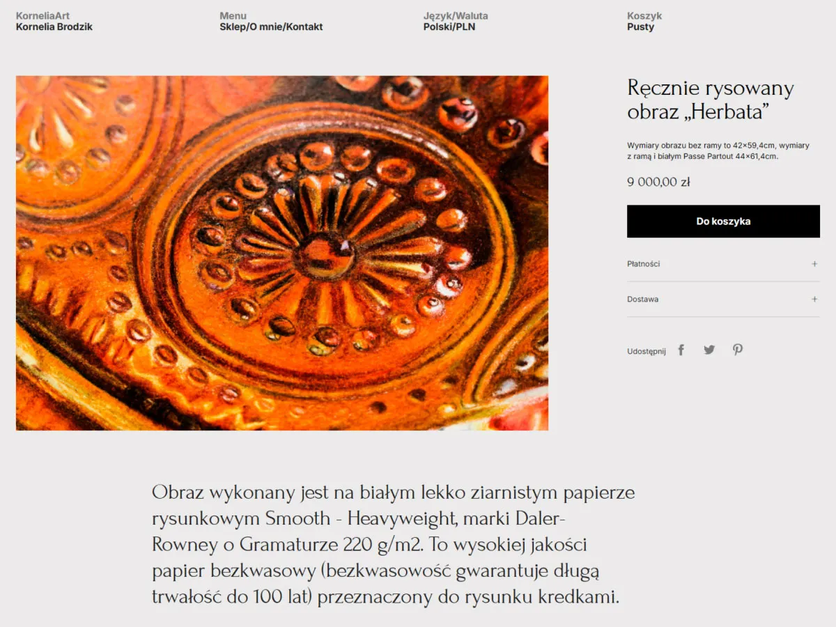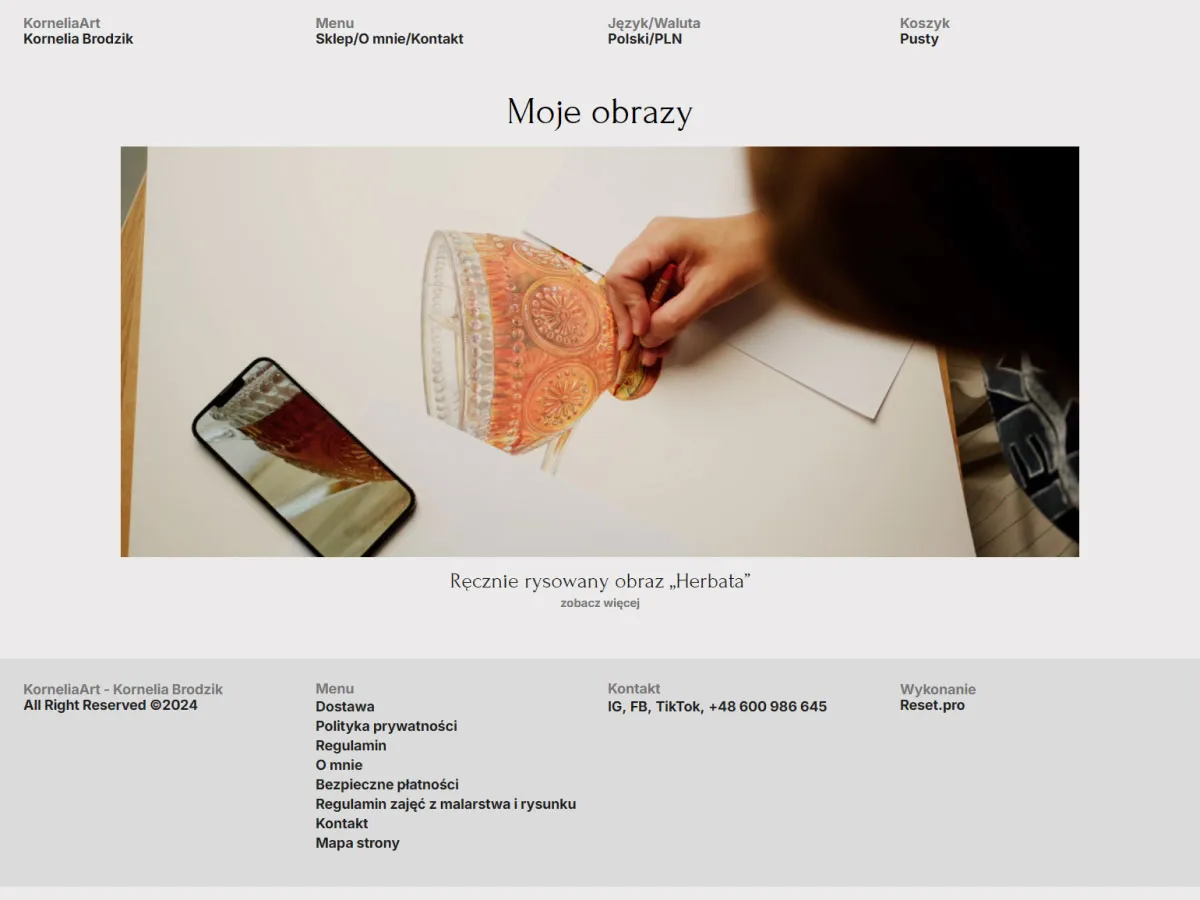 Sklep buduje prestiżową obecność online artystki, zapraszając do odkrywania i nabywania wyjątkowych dzieł w eleganckiej, cyfrowej galerii.