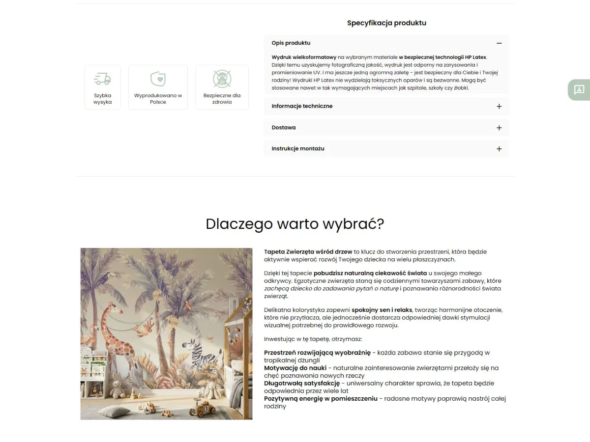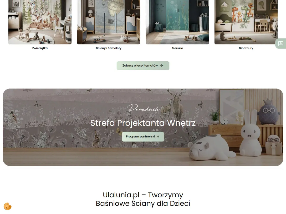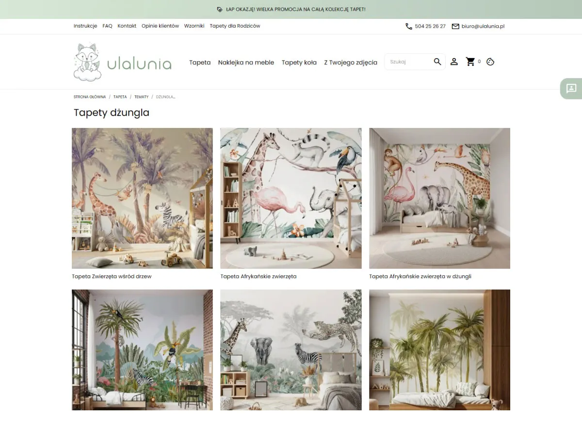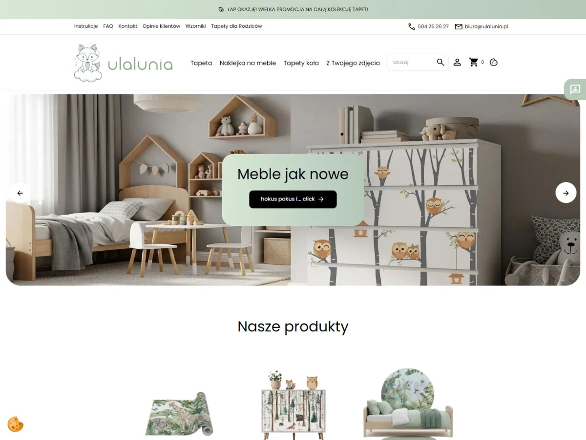 Responsywny layout, czytelna kategoryzacja (tapety, naklejki, strefa projektanta wnętrz) oraz rozbudowane opisy pomagają klientom szybko odnaleźć idealne dekoracje do pokoi dzieci ? od motywów natury po kosmiczne przygody. Sklep wspiera content marketing poprzez sekcję blogową, poradnikową i inspiracje, wzmacniając wizerunek Ulalunia.pl jako specjalisty od bezpiecznych, ekologicznych aranżacji dziecięcych wnętrz.